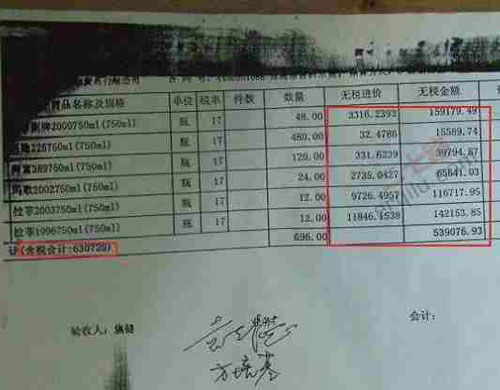 網(wǎng)上所公布的多張發(fā)票復(fù)印件顯示,此次被曝光的企業(yè)是“中國石油化工股份有限公司廣東石油分公司”,所進(jìn)酒水多為“拉菲”等名貴洋酒及高價(jià)茅臺(tái)酒。其中,僅一瓶拉菲1996(750ml)的無稅進(jìn)價(jià)就高達(dá)11846元。另一張貴州茅臺(tái)酒銷售有限公司所開的發(fā)票顯示,中石化廣東分公司一次性購買了近82萬元的茅臺(tái)酒。