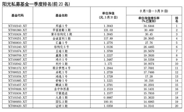 陽光私募基金一季度排名(前20名)