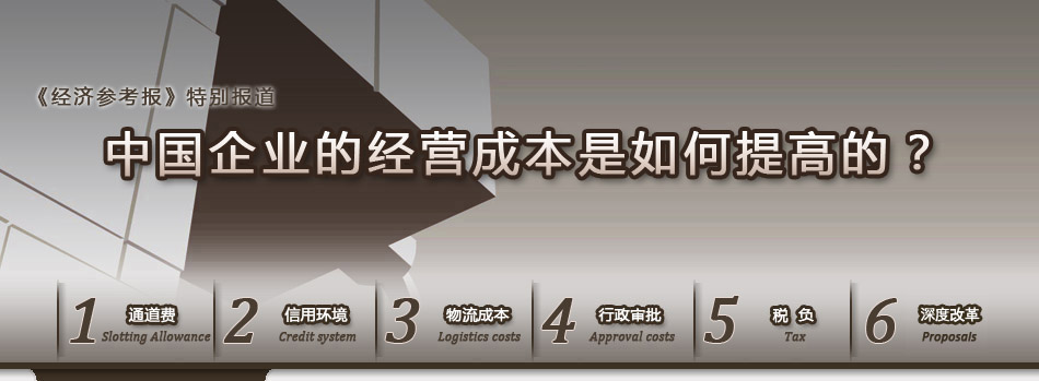 當(dāng)前,在全球競(jìng)爭(zhēng)越來(lái)越激烈的情況下,中國(guó)企業(yè)面臨的壓力日益增大,其中,企業(yè)經(jīng)營(yíng)成本高企是造成這種壓力的一個(gè)重要原因!督(jīng)濟(jì)參考報(bào)》記者近日深入調(diào)研發(fā)現(xiàn),在原材料價(jià)格上漲,人力成本升高等外部因素之外,巨額通道費(fèi)用、天價(jià)路橋費(fèi)、愈演愈烈的“蓋章成本”等壓力正疊加作用于企業(yè),令其成本驟增、利潤(rùn)大幅縮水。通過(guò)對(duì)中國(guó)企業(yè)經(jīng)營(yíng)成本增加圖景的鳥(niǎo)瞰,我們可以清晰地感受到:市場(chǎng)經(jīng)濟(jì)在中國(guó)發(fā)展至今,其內(nèi)在機(jī)制迫切需要再一次的優(yōu)化與升級(jí)。從今天起,本報(bào)深度版將以“中國(guó)企業(yè)的經(jīng)營(yíng)成本是如何提高的?”為主題,刊登一組分析報(bào)道,敬請(qǐng)讀者關(guān)注。 |