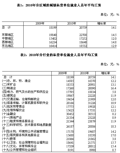 2010年全國城鎮(zhèn)私營單位就業(yè)人員年平均工資為20759元,與2009年的18199元相比,增加了2560元,同比增長14.1%,增幅提高7.5個百分點。私營單位就業(yè)人員年平均工資低于城鎮(zhèn)非私營單位在崗職工平均工資,但增長速度高于非私營單位0.6個百分點。