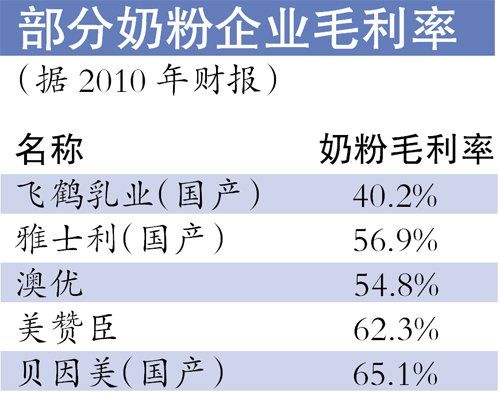 據(jù)調(diào)研公司Euromonitor的統(tǒng)計(jì),上述6大“洋奶粉”在國(guó)內(nèi)奶粉市場(chǎng)份額約為40.1%!把竽谭邸钡拿适欠裼痔貏e高呢?本報(bào)翻查上市公司年報(bào)發(fā)現(xiàn),嬰幼兒奶粉尤其是高端奶粉毛利率普遍較高,國(guó)產(chǎn)品牌如貝因美毛利率更站上65.1%,甚至高過一些“洋奶粉”。