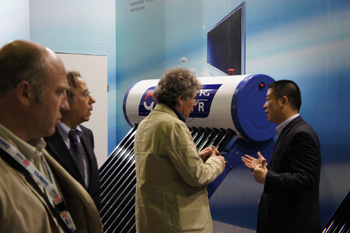華揚技術人員向外商介紹太陽能產品。記者 王星橋