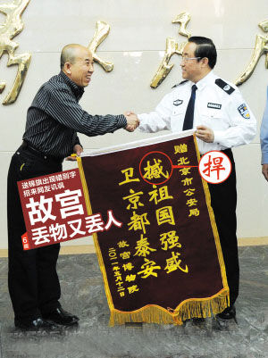 故宮竊案破獲之后,5月13日,故宮博物院副院長紀(jì)天斌等相關(guān)負(fù)責(zé)人來到北京市公安局贈(zèng)送錦旗,對(duì)市公安局迅速破獲故宮博物院展品被盜案表示感謝。這本來是一件“例行公事”,誰料只有10字感謝語的錦旗上居然還出現(xiàn)了一個(gè)錯(cuò)別字,導(dǎo)致意思完全相反,引來眾多網(wǎng)友“圍觀”。展品竊案和建福宮成私人會(huì)所余波未平,故宮再度陷入爭(zhēng)議漩渦。 當(dāng)天,由北京市公安局局長傅政華親自接過的一面錦旗上,上書10個(gè)大字:撼祖國強(qiáng)盛