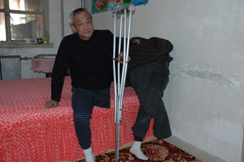 依靠一條假肢,50多歲的袁寶福一路蹣跚著回到家里,劇烈的疼痛讓他黑瘦的額頭沁出滴滴汗珠!耙晃慌笥褎偛沤o我買了件襯衫,原來(lái)的那件實(shí)在穿不下去了,自己又沒(méi)錢買……”