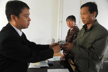 在烏魯木齊市米東區(qū)米東康居苑小區(qū)物業(yè)辦公室,白和西(右)從烏魯木齊房地產(chǎn)開發(fā)(集團(tuán))有限公司廉租房管理服務(wù)中心工作人員手中接過新房鑰匙。