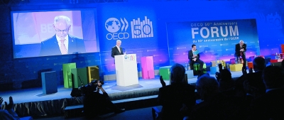 5月24日,在法國首都巴黎,歐洲理事會主席范龍佩(左)在經(jīng)合組織50周年論壇和部長會議開幕式上講話。 為期三天的經(jīng)合組織50周年論壇和部長會議當(dāng)日在巴黎召開。經(jīng)合組織秘書長安赫爾·古里亞表示,今天的經(jīng)合組織不是一個(gè)智庫,而是一個(gè)“為最優(yōu)生活而促進(jìn)并實(shí)踐最優(yōu)政策”的政府間組織。
