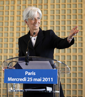 2011年5月25日,法國(guó)財(cái)政部長(zhǎng)拉加德在法國(guó)首都巴黎舉行的新聞發(fā)布會(huì)上講話。 當(dāng)日,拉加德宣布候選國(guó)際貨幣基金組織(IMF)總裁一職。