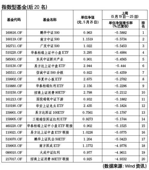 鵬華基金管理有限公司旗下的,2010年2月成立的鵬華中證500以-5.59%的凈值增長率成為本周(5月19日-25日)指數型基金收益倒數第一,其今年以來年漲幅為-7.29%。