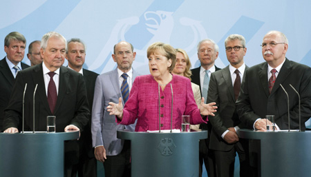 5月30日,在德國(guó)首都柏林,德國(guó)總理默克爾(中)在接受能源供應(yīng)安全倫理道德專家委員會(huì)遞交的《德國(guó)的能源轉(zhuǎn)折》報(bào)告書前發(fā)表講話。
