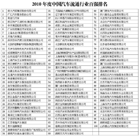 5月30日,中國(guó)汽車(chē)流通協(xié)會(huì)對(duì)外正式發(fā)布了2010年度中國(guó)汽車(chē)經(jīng)銷商集團(tuán)百?gòu)?qiáng)排行榜,龐大汽貿(mào)股份有限公司等100家汽車(chē)銷售企業(yè)榜上有名。