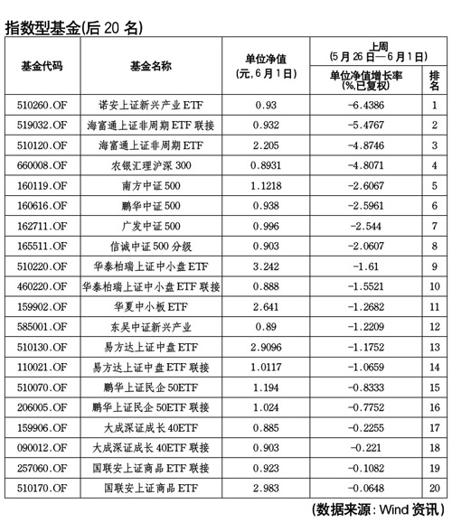 諾安基金管理有限公司旗下的,2011年4月成立的諾安上證新興產(chǎn)業(yè)以-6.44%的凈值增長(zhǎng)率成為本周(5月26日-6月1日)指數(shù)型基金收益倒數(shù)第一,其今年以來(lái)年漲幅為-7.7%。