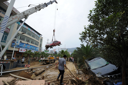 6月7日,起重機在望謨縣街頭將被洪水損壞的汽車吊起。