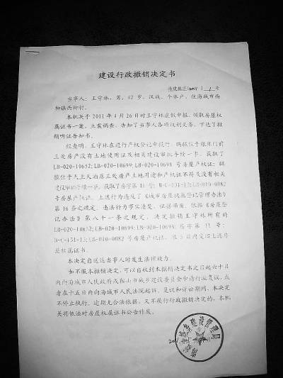 海城市城建局發(fā)給王守林的《建設(shè)行政撤銷決定書》。王晨