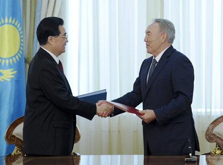 國(guó)家主席胡錦濤13日在阿斯塔納同哈薩克斯坦總統(tǒng)納扎爾巴耶夫舉行會(huì)談。胡錦濤希望雙方共同努力,爭(zhēng)取到2015年將中哈貿(mào)易額提高到400億美元。中方愿同哈方加快推進(jìn)兩國(guó)油氣管道和中國(guó)-中亞天然氣管道新項(xiàng)目建設(shè),加強(qiáng)核能、太陽(yáng)能、風(fēng)能等清潔能源和新能源領(lǐng)域合作。會(huì)談結(jié)束后,兩國(guó)簽署了《中哈關(guān)于發(fā)展全面戰(zhàn)略伙伴關(guān)系的聯(lián)合聲明》。