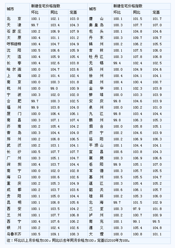 3、2011年5月份,59個城市的新建住宅價格指數(shù)根據(jù)網(wǎng)簽數(shù)據(jù)計算,其他11個城市根據(jù)統(tǒng)計系統(tǒng)房地產(chǎn)開發(fā)統(tǒng)計報表中各個項目的分類銷售面積和金額數(shù)據(jù)計算。59個網(wǎng)簽數(shù)據(jù)城市分別是:北京、天津、石家莊、太原、呼和浩特、沈陽、大連、長春、哈爾濱、上海、南京、杭州、寧波、合肥、福州、廈門、南昌、濟南、青島、鄭州、武漢、長沙、廣州、深圳、南寧、海口、重慶、成都、貴陽、昆明、西安、蘭州、西寧、銀川、烏魯木齊、秦皇島、包頭、丹東、吉林、牡丹江、無錫、揚州、徐州、溫州、金華、泉州、九江、洛陽、平頂山、宜昌、岳陽、惠州、湛江、韶關、桂林、北海、三亞、瀘州、南充。5月份新增加的城市是溫州。