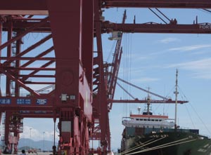 2010年8月26日,韓國集裝箱班輪“中海向珠”成功靠泊梅山港區(qū)1號泊位,標志著梅山保稅港區(qū)10條韓國航線正式開通,這也是寧波梅山港區(qū)靠泊的首艘集裝箱班輪。資料照片 |