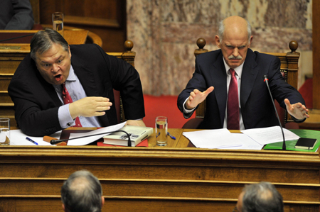 6月22日,希臘總理帕潘德里歐(右)在雅典議會(huì)會(huì)議上與新任財(cái)政部長(zhǎng)韋尼澤洛斯握手慶祝贏得議會(huì)信任投票。 希臘總理帕潘德里歐日前對(duì)內(nèi)閣成員進(jìn)行大幅調(diào)整,以緩解民眾及執(zhí)政黨內(nèi)部對(duì)實(shí)施更強(qiáng)力緊縮政策的不滿情緒,并加大推動(dòng)改革的力度。