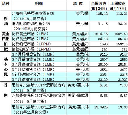 國際大宗商品期貨價(jià)格明細(xì)表[2011-06-27]