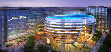 投資超過31億元人民幣、緊鄰京滬高鐵上海站的上!昂鐦蛱斓亍表椖吭敿氃O(shè)計方案發(fā)布。由香港瑞安房地產(chǎn)有限公司投資的“虹橋天地”項目,位于上海虹橋商務(wù)區(qū)6號地塊,占地面積約6.2萬平方米,建筑總面積達38萬平方米。該項目將于年內(nèi)開工,預計于2013年竣工。圖為上海“虹橋天地”項目夜間景觀效果圖。