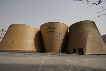 圖為位于上海世博園區(qū)內(nèi)的萬科館。由于建筑外墻面使用了秸稈板,萬科館宛如金燦燦的麥垛矗立在浦江西畔。 |