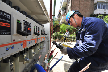 據(jù)預(yù)測,天津市今夏最大用電負(fù)荷將出現(xiàn)在7月下旬或8月上旬,最大電力缺口可達(dá)150萬千瓦。圖為國家電網(wǎng)天津城西供電分公司配電施工人員在南開區(qū)府湖里居民小區(qū)進(jìn)行低壓開關(guān)柜升級改造。新華社發(fā)(吳宣述攝) |