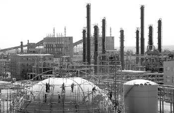新疆哈密工人在廣匯120萬噸甲醇/80萬噸二甲醚、5億立方米煤制天然氣項目工地上施工。資料照片 |