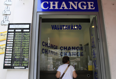 18日,一名顧客在布達佩斯外匯兌換處。當日匈牙利福林兌瑞士法郎匯率跌至歷史新低,兌歐元跌至四個月來低點,同日波蘭貨幣也大幅貶值。歐債危機持續(xù)令投資者更加青睞避險資產(chǎn),從而沉重打壓了歐元區(qū)邊緣國家資產(chǎn)價格和貨幣幣值。