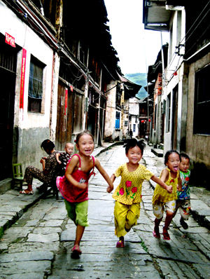 羊樓洞因茶而興,然而走在今日的石板街上,卻少見以茶為生的人家。街面全以青石鋪設(shè),蜿蜒穿過一排排青磚黑瓦的小木樓,孤獨(dú)的老人們坐在低矮的房檐下守候著流水的光陰。歷代運(yùn)茶的“雞公車”將石板碾成寸余深槽,據(jù)說是那個(gè)年代鄰近的鄉(xiāng)鎮(zhèn)運(yùn)送茶葉和貨物時(shí)碾壓而成的,可見當(dāng)時(shí)茶市的興盛。