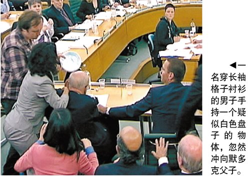 電視直播的畫(huà)面顯示,這位身穿長(zhǎng)袖格子襯衫的男子,從老默多克的左側(cè)忽然沖向聽(tīng)證席。坐在聽(tīng)證席右側(cè)的小默多克首先發(fā)現(xiàn)不明襲擊者,他迅速躲過(guò)了襲擊并提醒父親小心。