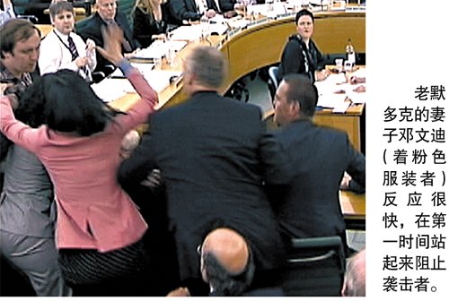 老默多克的反應(yīng)則沒(méi)有這么快。不過(guò)坐在第二排的默多克妻子鄧文迪,在第一時(shí)間站起來(lái)阻止襲擊者。英國(guó)媒體形容鄧文迪的這一下意識(shí)反應(yīng)“猶如老虎般迅猛”。