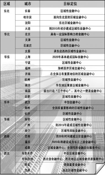 至此,我國內地至少有30多個城市提出規(guī)劃建設金融中心。其中,上海、北京要建設“國際金融中心”,昆明、南寧和烏魯木齊分別要建“泛亞金融中心”、“區(qū)域性國際金融中心”、“中亞區(qū)域金融中心”,其余20多個城市,也雄心勃勃提出所在區(qū)域的“金融中心”。如何看待各地爭建金融中心這一現象?中國是否需要這么多的金融中心?