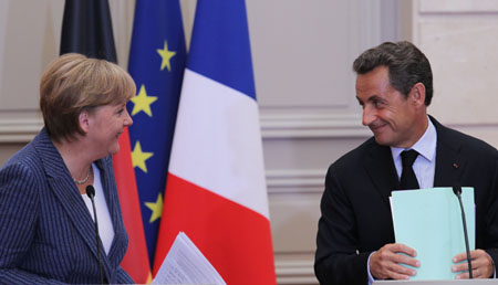 8月16日,法國(guó)總統(tǒng)薩科齊(右)與來(lái)訪的德國(guó)總理默克爾在總統(tǒng)府愛(ài)麗舍宮出席聯(lián)合記者招待會(huì)。