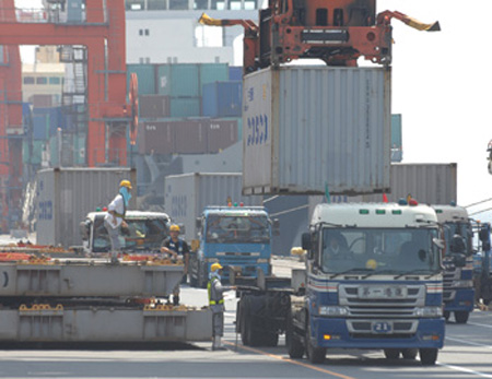 8月18日,卡車在日本東京大井集裝箱碼頭裝貨。 日本財務省18日發(fā)表的7月貿(mào)易統(tǒng)計數(shù)據(jù)顯示,當月日本出現(xiàn)725億日元(約合9.48億美元)的貿(mào)易順差,這是連續(xù)第二個月出現(xiàn)順差,但順差額同比減少90.8%。分析人士認為,新發(fā)布的數(shù)據(jù)說明日本正在擺脫東日本大地震導致的出口大幅下滑的影響,因而再次出現(xiàn)貿(mào)易順差。