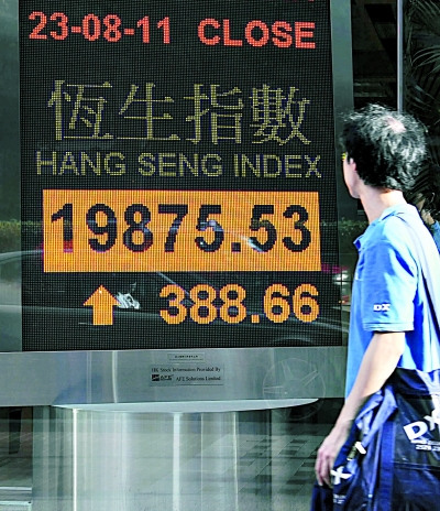 圖為23日一市民從香港灣仔一家銀行的恒生指數(shù)電子顯示屏前走過。