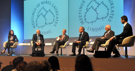 8月24日,在德國林道舉行的第四屆諾貝爾經(jīng)濟學獎得主大會上,2000年、2001年和2007年諾貝爾經(jīng)濟學獎得主丹尼爾·麥克法登(右二)、約瑟夫·斯蒂格利茨(左二)和羅杰·邁爾森(右三)等出席了與青年學者的首場交流會。