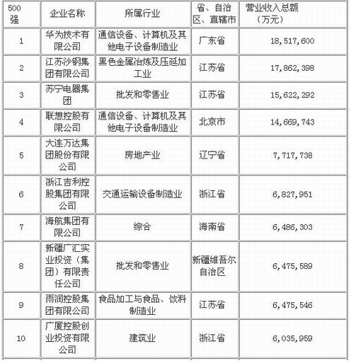 根據(jù)2010年中國民營企業(yè)500強(qiáng)名錄提供的數(shù)據(jù)中國經(jīng)濟(jì)網(wǎng)記者經(jīng)過計算得出,華為、沙鋼等前十家的2011年營業(yè)收入之和約為10669億元,而據(jù)2011年中國500強(qiáng)公布的數(shù)據(jù)顯示,僅中石化一家的收入就達(dá)約19131億元。