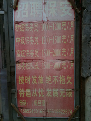 在鄭州火車站布廠街附近,沿著一條窄窄的胡同走進去,一棟兩層小樓毫不起眼地立在三岔路口,第二層的部分外墻甚至都沒粉刷,紅色磚頭清晰可見。樓下是一塊“招聘保安”的廣告牌,因為風(fēng)吹雨淋,底色已經(jīng)由紅變白。上面依次寫著初級、中級、高級保安員以及保安隊長的月薪,并且承諾“按時發(fā)放,絕不拖欠,待遇從優(yōu),發(fā)展無限!