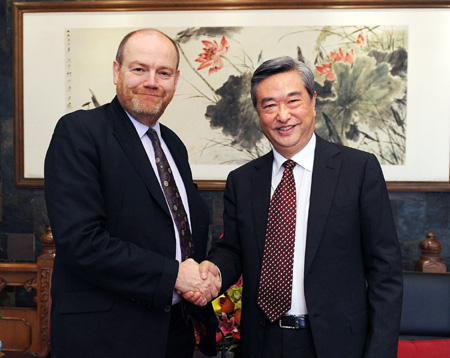 世界媒體峰會(huì)主席團(tuán)會(huì)議27日在北京舉行。這是繼2009年世界媒體峰會(huì)成功舉辦之后,國(guó)際傳媒領(lǐng)域的又一次高端論壇。與會(huì)代表在坦誠(chéng)友好的氣氛中積極互動(dòng),充分交流,就一系列問題達(dá)成共識(shí),會(huì)議成果豐富。 圖為9月28日,新華通訊社社長(zhǎng)李從軍在北京釣魚臺(tái)國(guó)賓館會(huì)見出席峰會(huì)的英國(guó)廣播公司總裁馬克·湯普森。
