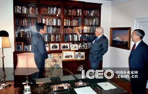 2011年8月22日,黃怒波(左一)在冰島總統(tǒng)格里姆松(左二)家中,總統(tǒng)向他展示滿櫥的詩歌書籍(資料圖:中國企業(yè)家網(wǎng))