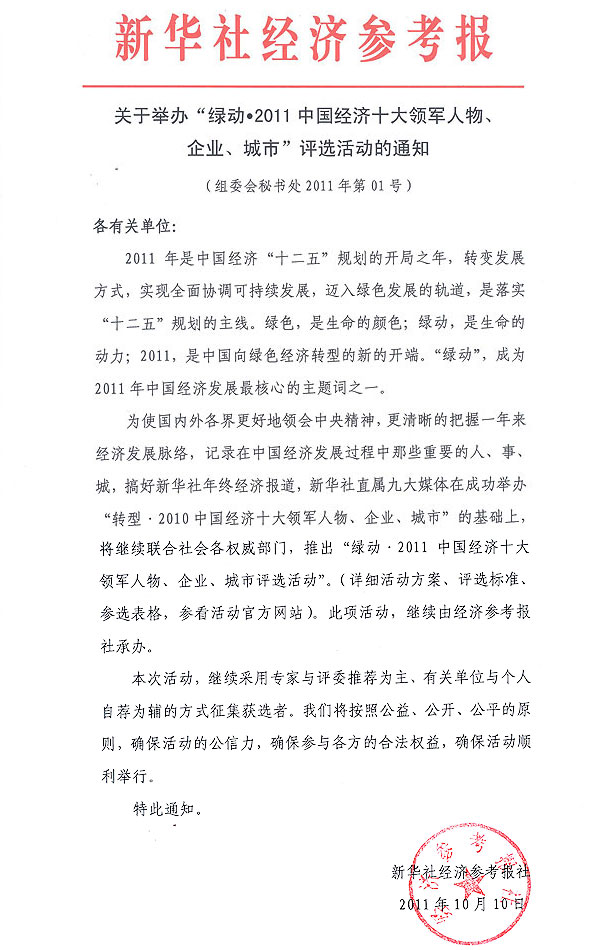 關(guān)于舉辦"綠動2011中國經(jīng)濟十大領(lǐng)軍人物、企業(yè)、城市"