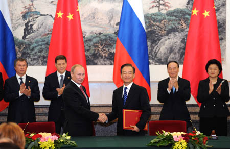 圖為溫家寶和普京在會晤后共同出席的簽字儀式上握手。