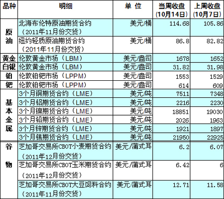 當(dāng)周國際金價(jià)獲得支撐,金價(jià)累計(jì)上漲2.9%。另外,投資者對(duì)歐元信心的增強(qiáng)導(dǎo)致美元走弱,而弱勢(shì)美元也有利于支撐貴金屬等大宗商品市場(chǎng)。芝加哥農(nóng)產(chǎn)品期貨價(jià)格當(dāng)周集體上揚(yáng)。據(jù)美國農(nóng)業(yè)部14日公布的出口報(bào)告,美國在截至10月6日一周共出口玉米134.4萬噸,高于此前市場(chǎng)預(yù)期,也是近5周以來第三周出口量超過100萬噸。同時(shí),當(dāng)周美國出口小麥50萬噸,同樣高于此前分析師的預(yù)測(cè)。除以上因素外,大豆期貨價(jià)格還受到能源價(jià)格大漲的影響而實(shí)現(xiàn)連續(xù)上行。