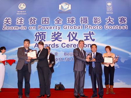 當(dāng)日,由新華社與聯(lián)合國(guó)開(kāi)發(fā)計(jì)劃署聯(lián)合發(fā)起舉辦的“關(guān)注貧困全球攝影大賽”頒獎(jiǎng)儀式在北京舉行。
