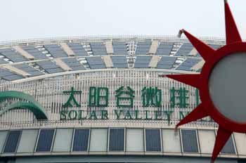 當(dāng)你走近中國(guó)太陽(yáng)谷時(shí),首先遠(yuǎn)遠(yuǎn)映入眼簾的就是高大的太陽(yáng)能圖騰矩陣。上頭是風(fēng)電裝置和太陽(yáng)能電池板,中間是太陽(yáng)能LED顯示時(shí)間,而基座上則是世界各地有關(guān)太陽(yáng)能文化的浮雕,極具世界文化風(fēng)采。