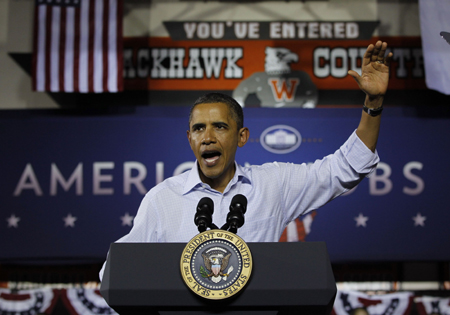 10月17日,美國總統(tǒng)奧巴馬在北卡羅來納州阿什維爾市發(fā)表演講。 奧巴馬當日表示,就業(yè)問題是美國各地民眾最關(guān)心的議題之一,美國會應當盡快通過就業(yè)促進法案,通過加大基礎(chǔ)設施投資等方式創(chuàng)造民眾迫切需要的就業(yè)崗位。奧巴馬17日開始在北卡羅來納州和弗吉尼亞州進行為期三天的巡回演講。