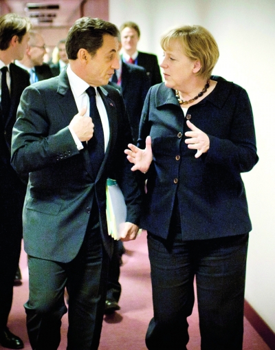 圖為10月22日,在比利時(shí)首都布魯塞爾的歐洲理事會(huì)總部,德國總理默克爾(右)與法國總統(tǒng)薩科齊在理事會(huì)大廈的走廊上交談。