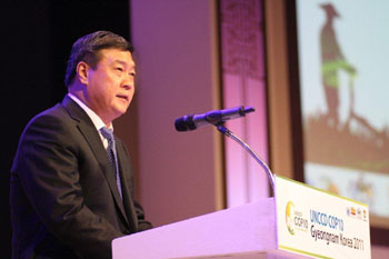 據(jù)了解,本次會議是該組織大會首次在亞洲召開。全球各國對本次會議高度重視,第66屆聯(lián)大主席納賽爾、韓國總理李明博以及聯(lián)合國負責(zé)經(jīng)濟和社會事務(wù)的副秘書長沙祖康均出席會議并發(fā)表講話。聯(lián)合國秘書長潘基文也通過錄像發(fā)表致辭。來自44個國家的部長以及數(shù)千名世界各地的政府官員、國際組織和非政府組織代表與會。《聯(lián)合國防治荒漠化公約》是聯(lián)合國環(huán)境與發(fā)展大會框架下的三大環(huán)境公約之一,1996年12月正式生效,目前共有191個締約方。