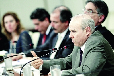 圖為巴西財(cái)長(zhǎng)曼特加在發(fā)表講話。