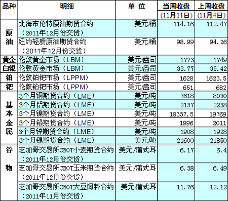 國際大宗商品期貨價(jià)格明細(xì)表[2011-11-14]