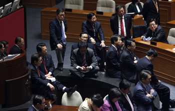 韓美自貿(mào)協(xié)定在韓國備受爭議,尤其是執(zhí)政黨和在野黨對此意見分歧極大。 圖為11月22日,在韓國首爾,韓國在野黨議員在韓國執(zhí)政黨單獨表決通過了韓美自由貿(mào)易協(xié)定履行法案后聚集在國會會場。新華社/路透 |